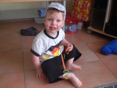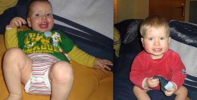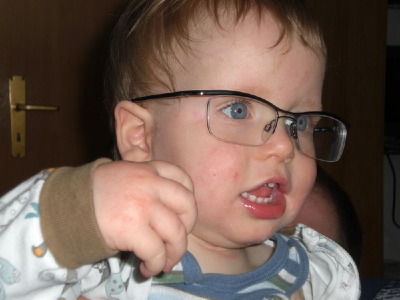 heute war wieder ein tag wo papa und mama viel mit uns unterwegs waren. waren beim einen mann der so ein spiegel hat der war nett und gab uns den spiegel zum spielen. mama sagt es war der zahnarzt der schaut immer in den mund, mir lasse fehlen nur noch 3 zähne dann bin ich komplett und er war sehr zufrieden mit mir und meinem bruder dem noch 14 zähne fehlen. wir haben auch heute unsere ersten laufschuhe bekommen, sind ganz stolz drauf laufen noch etwas unsicher aber das wird schon. ach ja und ne blöde impfe haben wir auch bekommen so jetzt haben wir aber alles.
