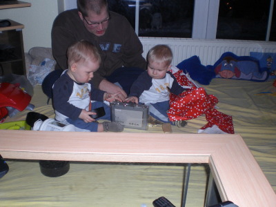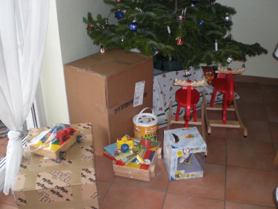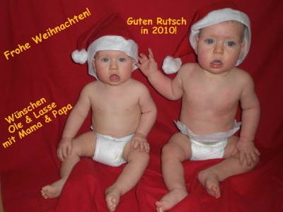 boah waren das tolle aufregende tage. wir haben unter so einen grünen ding viel buntes papier liegen sehen mit inhalt. mama sagt das ist weihnachten gewesen und der weihnachtsmann so ein dicken im roten ding und weissen haaren hat sie gebracht. egal, es war aufregend das wir nicht so gut geschlafen haben, tut uns leid mama. aber ich ole hab mein 3 zahn und lasse hat mama festgestellt seinen 11 zahn. vielleicht lag es auch etwas daran. tante petra und onkel holger mit waui waren da wir haben uns riesig gefreut und vermisse sie. ach ja silverster war ja auch ???? egal was es ist. wir haben es verschlafen.