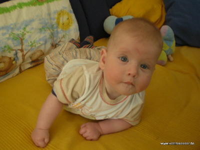 ich lasse wollte euch mal den beweis zeigen das ich stehen kann wie ne eins. puhh.... tja, ich ole mache das ganz anders. ich beginne mich in krabbeln zu üben, sieht zwar noch im moment aus als wollte ich mein hintern in die sonne strecken aber wartet mal ab. du lasse...lass ich eiskalt STEHEN und du kannst wenn ich super krabbeln kann mein hintern in einer staubwolke erahnen :-).