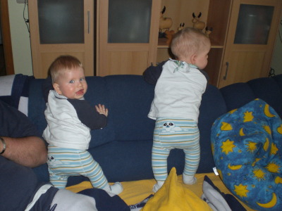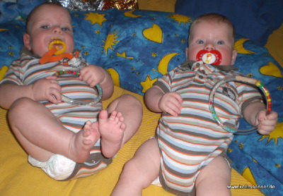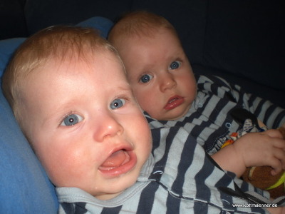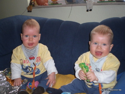 wir entschuldigen uns erstmal dafür das wir unsere kleine große Fangemeinde solange haben warten lassen bis wir uns wieder melden. wir haben in der letzten woche unsere erste erkältung durch gemacht und haben teilweise ganz schön gelitten, unsere nasen sind immer noch nicht richtig frei, aber mama und der doc sagen das wird schon wieder!! ich lasse arbeitet zusätzlich daran meine knabberleiste auzubauen, es sind wohl schon zahn nr 5,6,7 unterwegs bzw da, der doc ist erstaunt von dieser leistung. ich sehe doch was papa so alles auf seinem teller hat und der schwärmt so von mamas kochkünsten, ich will auch endlich fleisch, pommes ect und nicht mehr diese babymilch das ist was für unseren ole , das baby!! ey du sack, weil du so verfressen bist bekommst gar nicht was hier sich alles so verändert, tick tack oma und oma aus heesen sind seit mittwoch da, mama und papa sind fleisig am putzten und seit gestern ist das wohnzimmer ausgeräumt und es wird alles ganz festlich aufgebaut, die großen sprechen immer von taufe!!! ich glaube das ist was kirchliches mit wasser auf den kopf und so, das pastor war vor einiger auch schon mal zubesuch. wir werden berichten wie es war und was alles passiert ist. übrings so ganz neben bei, packt mama koffer und papa macht die familienkutsche startklar und das wort urlaub ist auch mehrmals gefallen, was ist das und was wollen die jetzt schon wiedermit uns machen?? wir halten euch auf dem laufenden, versprochen!!! auch falls ihr es vergessen habt, wir sind heute ein halbes jahr alt geworden!!!