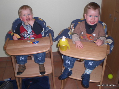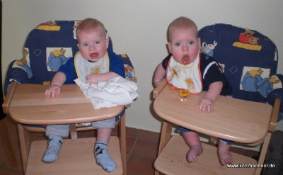 das we war sehr schön wir geniessen mittag´s den leckeren gelben brei immer mehr. mama hält uns zwar kurz (wir könnten mehr essen), sie meint nicht so viel sonst bekommen wir bauchweh. alles langsam steigern...was immer das auch heissen soll wir wollen mmmmehhrrrrr. ach ja und tolle stühle zum essen haben mama und papa für uns gekauft, tolle dinger wir fühlen uns jetzt wie prinzen auf dem throne :-).