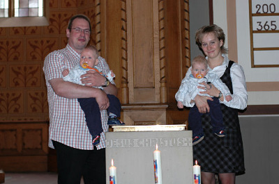 so am Sonnatg war die Taufe, wir waren in so einem alten Gebäude was sehr groß war und viele menschen waren da, ein mann in schwarzer kleidung hat uns wasser auf den kopf getrüffelt und sprüche dazu aufgesagt. mich ole hat die martina gehalten und der lasse wurde von holger gehalten, das sind jetzt unsere paten super geil!!!