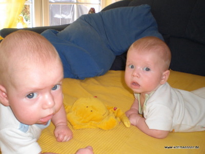 wir hatten tolle aktionstage, mama hat sich wirklich mühe gegeben das uns nicht langweilig wird. am dienstag waren wir in bad lippspringe jemanden von mama´s bekannten besuchen. da war so ein süßes mädchen von fast 2 jahren und lasse hat sich voll ins zeug gelegt, ich steh halt auf was reiferes :-)). am mittwoch haben wir unsere zwillingsmädchen besucht man muss sich ja alles warmhalten oder? heute waren wir in einem große kaufhaus (porta) und mama shoppte für uns einen tolle spieleteppich der ist voll klasse und zum guten abschluss heute hat papa mit uns den freischwimmer in der badewanne geübt, das macht uns immer sehr müde. ach übrigen wir haben vergessen zu erwähnen das wir toll alleine sitzen können der beweis folgt als bild sofort.