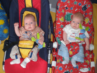 heute war mama mit uns bei diesem mann im weissen kittel den wir schon kennen. mama nennt ihn onkel doktor für orthopädie, weil wir ja so geschrien haben. der onkel doc. hat uns ganz dolle erschreckt das wir geweint haben aber weh hat es nicht getan. laut doc. hatte einer den hintern und der andere den hals verrängt. verraten aber nicht wer was hatte :-). in 4 wochen müssen wir nochmal hin. bin gespannt ob wir jetzt weniger schreien müssen.